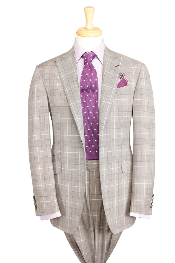 The suit features a smooth finish, wool plaid, with flap side pockets, a welt chest pocket, a right side ticket pocket, peak lapels, and double vents in back. The jacket is also fully canvassed, and fully lined.  Slim cut or classic cut optional. Other options include notch lapels, thread color, top stitching, button hole color, and many more.